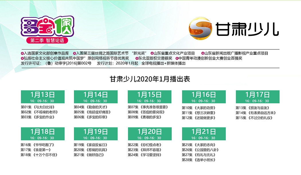 深受小朋友們喜愛的系列動畫片《多寶一家人》第二季智慧論語將于1月13日在甘肅少兒頻道開播。這是一部由山東豆神動漫有限公司制作、出品的優(yōu)秀原創(chuàng)系列動畫片。