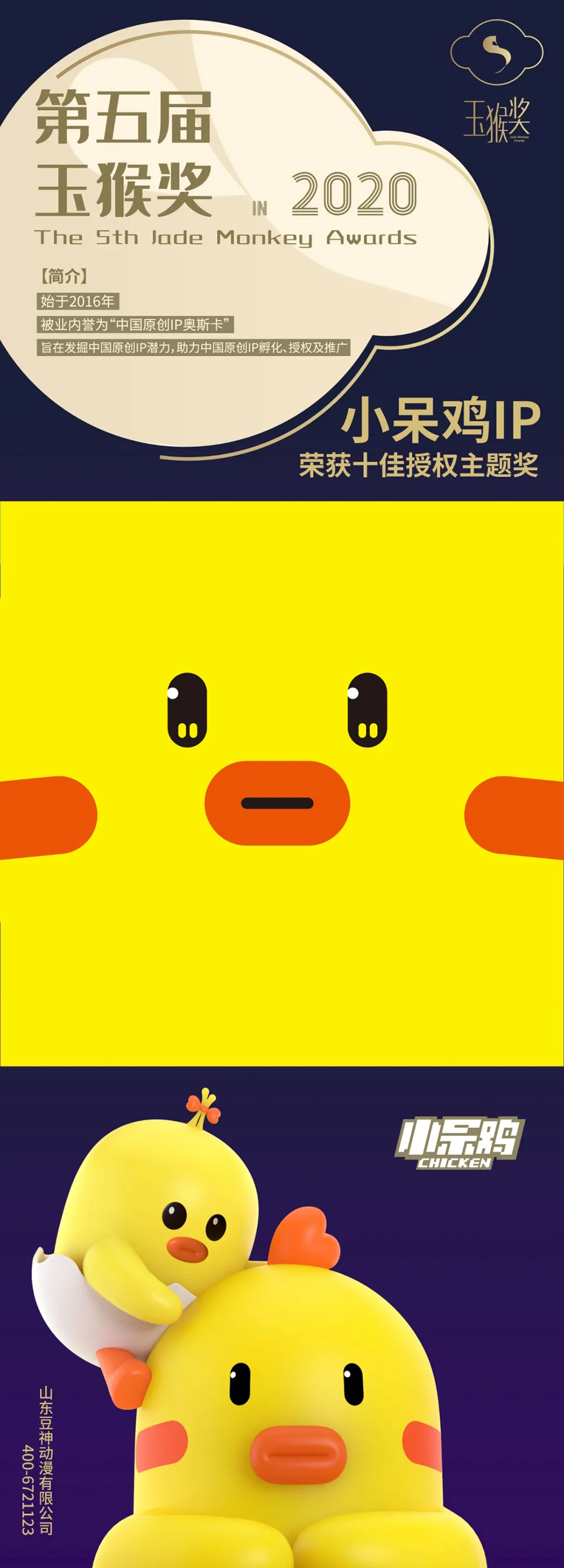 由中國IP產(chǎn)業(yè)年會組委會主辦的“第五屆玉猴獎”,經(jīng)過激烈角逐,山東豆神動漫有限公司出品的原創(chuàng)IP《小呆雞》獲2020年度十佳授權主題項目。